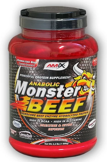 Az AMIX™ Monster Beef fehérjepor marhahúsból készül. Enzimatikus hidrolízis során egy sokkal gyorsabban felszívódó,előemésztett marhafehérjeport készítenek,mely a lehető leggyorsabban lehet képes az izmokban hasznosulni.Ezáltal gyorsabb izomnövekedés és regeneráció érhető el.Tartalmaz még kedvező arányú BCAA-t, Glutamine peptideket, valamint Nitro Shot Complex-et, mely biztosíthatja nagy mennyiségű fehérje oxigéndúsabb szállítását, közvetlenül az izmokba! Mindezen felül,kiegészítették PhosphoMatrix-szal,ami a szervezet ásványi anyag ellátásátban segíthet,nagyban megkönnyítheti a vesék működését is.