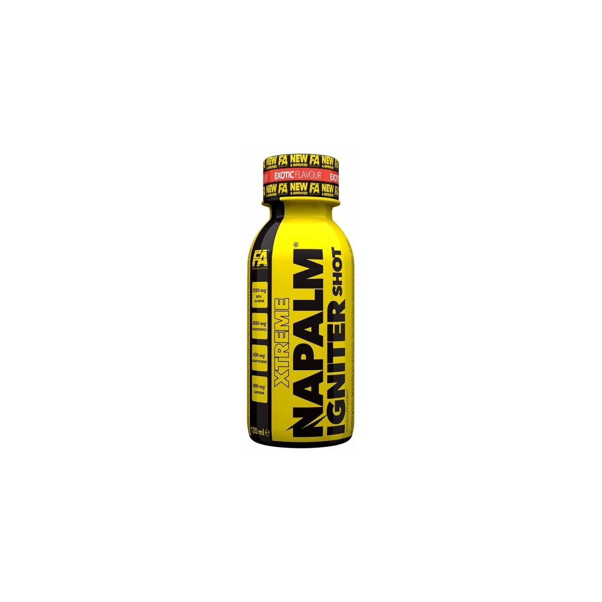 A FA Xtreme Napalm Igniter Shot egy extrém edzés előtti készítmény, ami motiválhat, hogy elmenj az edzőterembe és megküzdj a súlyokkal. A benne levő dinitrogén-oxid aktivátor és modern serkentőszerek keveréke elláthat energiával, tágíthatja az ereket, ezáltal biztosíthatja az izmok maximális vérellátását, felgyorsíthatja az izomtömeg növekedését is. Amennyiben hiányzik az energia és a motiváció az edzőteremben, akkor ez a termék a számodra készült. A szakszerűen kiválasztott összetevők segíthetnek növelni a edzésintenzitást, a nagyobb terhelést és a nagy tömegű izomzat fejlődését. Az izmok vérben bővelkednek, amely az olyannyira szükséges tápanyagokat és nyomelemeket, azaz az építőanyagokat biztosítja. A Napalm nem tartalmaz cukrot, így kontrollálhatod az energia bevitelt is. Egy adag fél ampulla ( 60 ml ), melyben 200 mg koffein, 1600 mg béta-alanin, 1000 mg taurin található, továbbá tartalmaz még glucuronolactont, kolin, GABA, koreai ginzeng, ashwagandha, rózsagyökér kivonat. Ezekkel a hatóanyagokkal kiegészülve, az eddig is igen hatékony és kedvelt shot, méginkább összetett lett. Teszteld!
