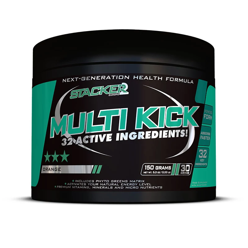 A Multi Kick egy új generációs, 32 aktív összetevőt tartalmazó multivitamin formula, amely extra adag vitamin, ásványi anyag, bioaktív összetevők, mikroelemek, antioxidánsok és zöldség kivonatok megfelelő arányával biztosítja a szervezetünk számára szükséges tápanyagokat. A Multi Kick, vízben oldódó por állagának köszönhetően, a benne levő hatóanyagok gyorsabban szívódnak fel a szervezetben és emelett a sok óriás tabletta lenyelésétől is megkímélhetjük magunkat.